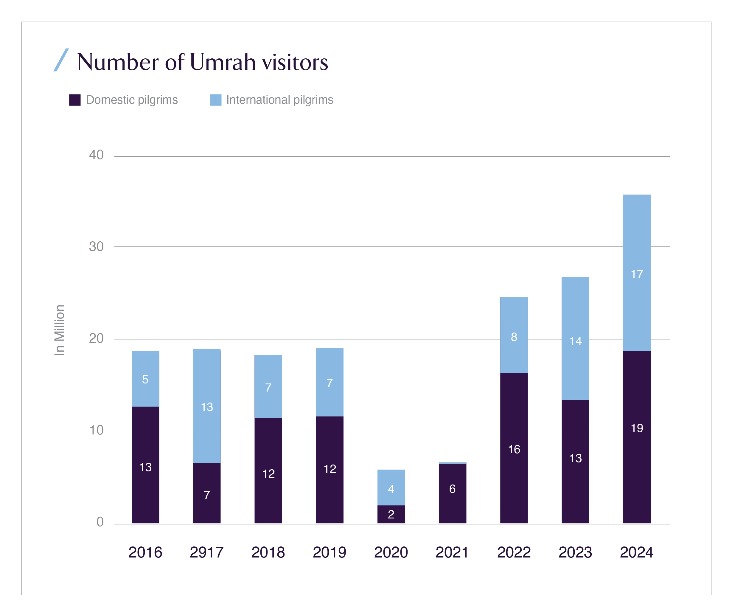 - Around 30 million international visitors, including 18.5 million pilgrims (Umrah and Hajj).