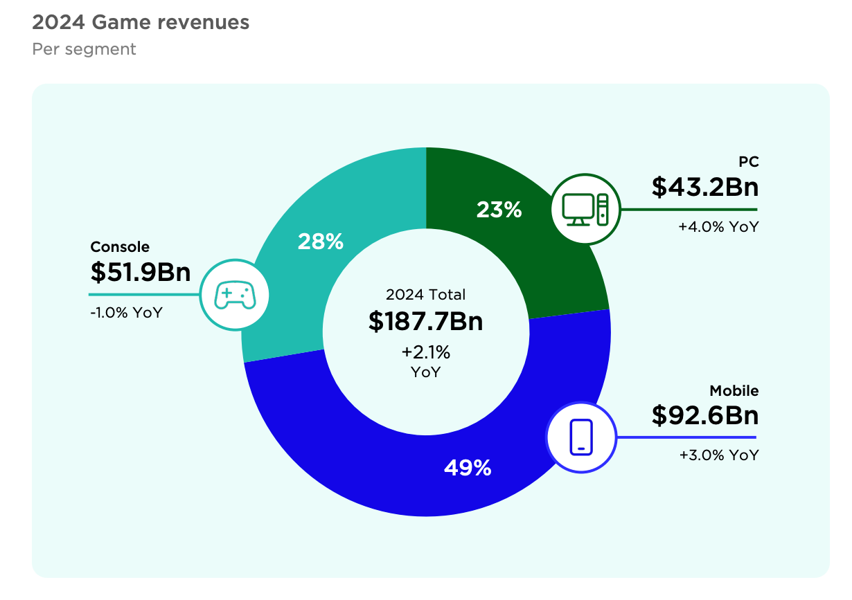 Newzoo’s 2024 Global Games Market Report estimates that the games industry generated roughly $187.7bn in revenue in 2024, up about 2.1% year-on-year. Mobile accounts for around $92.6bn (49% of the total), consoles for $51.9bn (28%), and PC for $43.2bn (23%). This is not a niche creative hobby; it is a capital-intensive, data-rich ecosystem with complex value chains: engines, tools, publishing, hardware, advertising, live operations, and user-generated content.