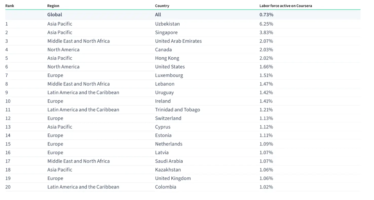 Saudi Arabia appears in the global top-20 for “online learners as a percentage of the labour force,” with roughly 1.07% of its labour force active on Coursera alongside the UAE at 2.07%. This signals that: