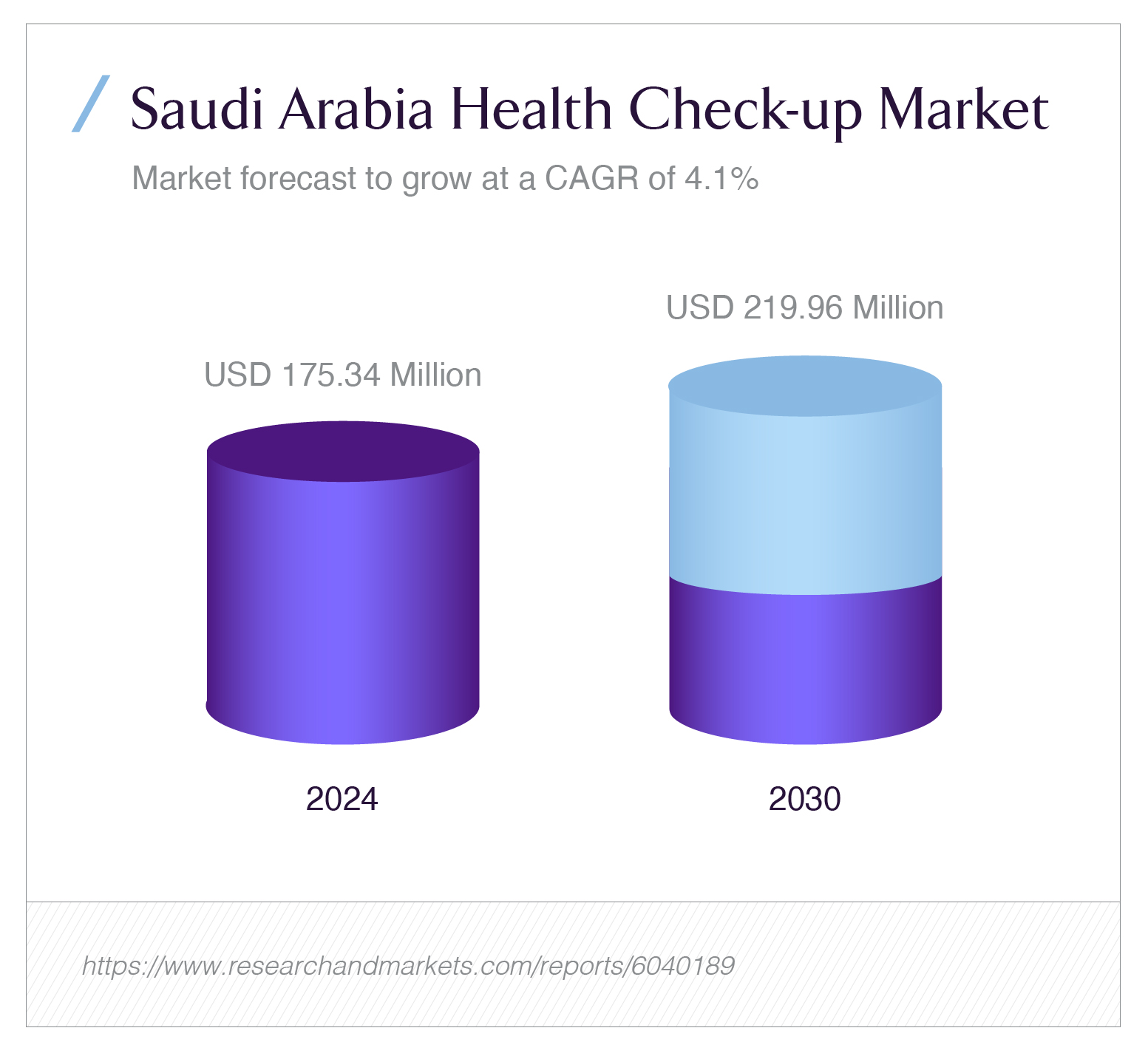- TechSci / ResearchAndMarkets estimate the Saudi Arabia health check up market at USD 175.34 million in 2024, rising to USD 219.96 million by 2030, implying steady expansion of private offers in corporate and retail segments.